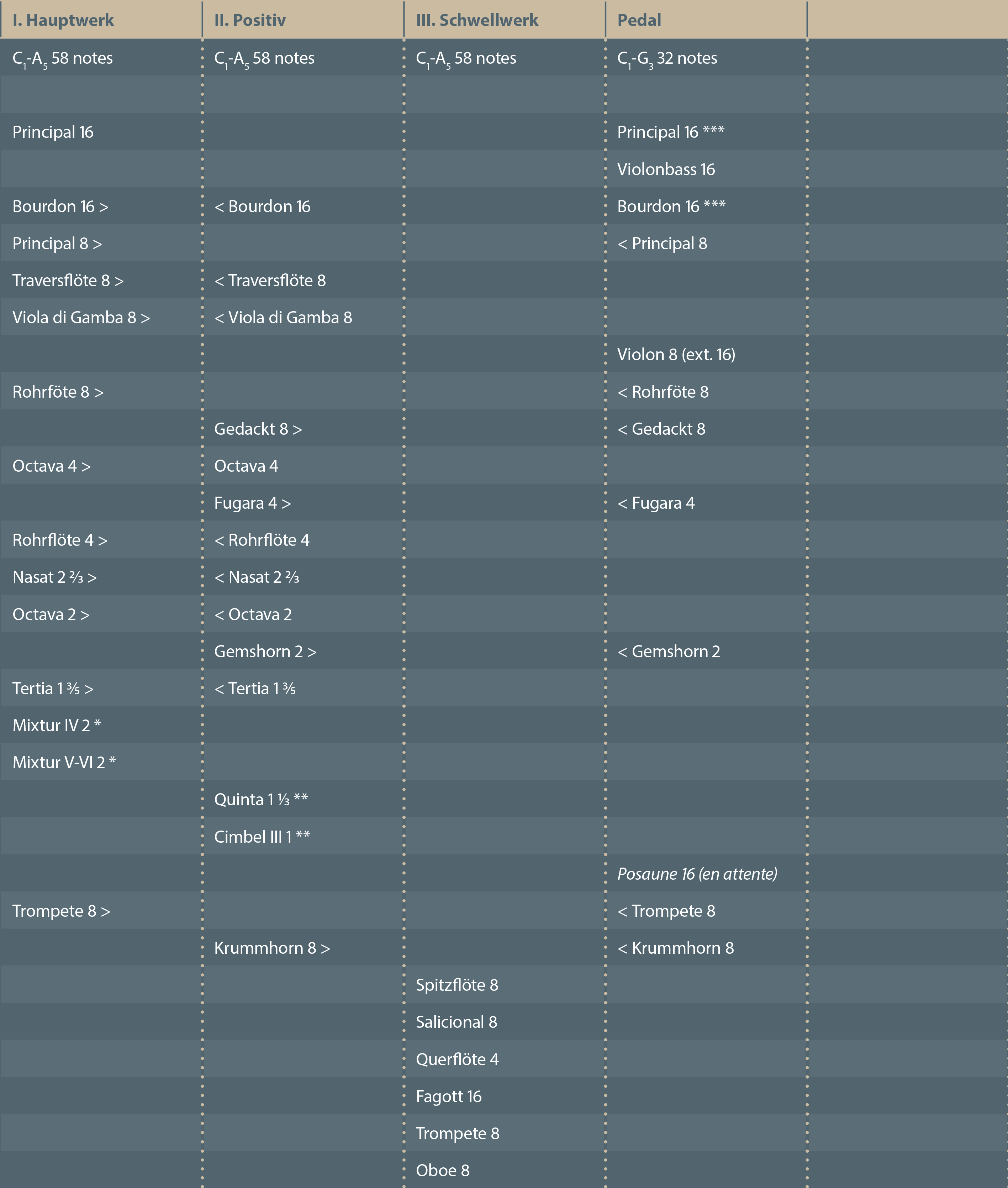 * : Mixtur à deux positions, soit en 8 pieds, soit en 16 pieds & rang de Tierces, on peut choisir l'une ou l'autre position.