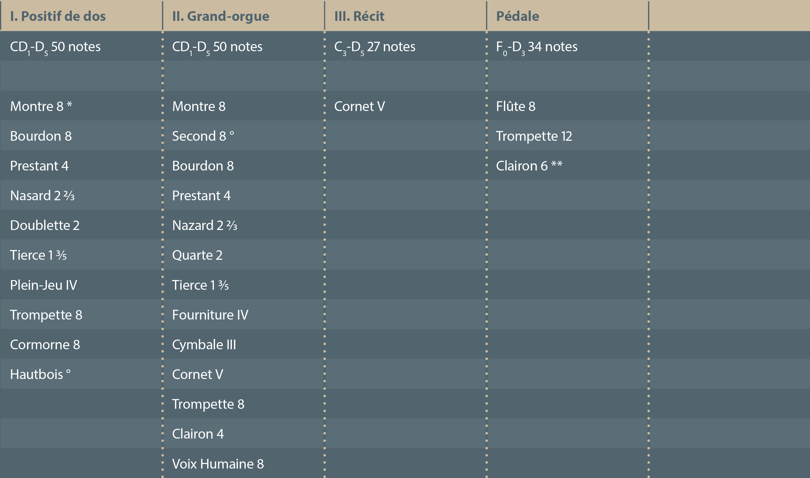 ** : le Clairon de Pédale est seulement sur le ravalement, de Fa0 à Si0 + Do#1 (sommier ancien)