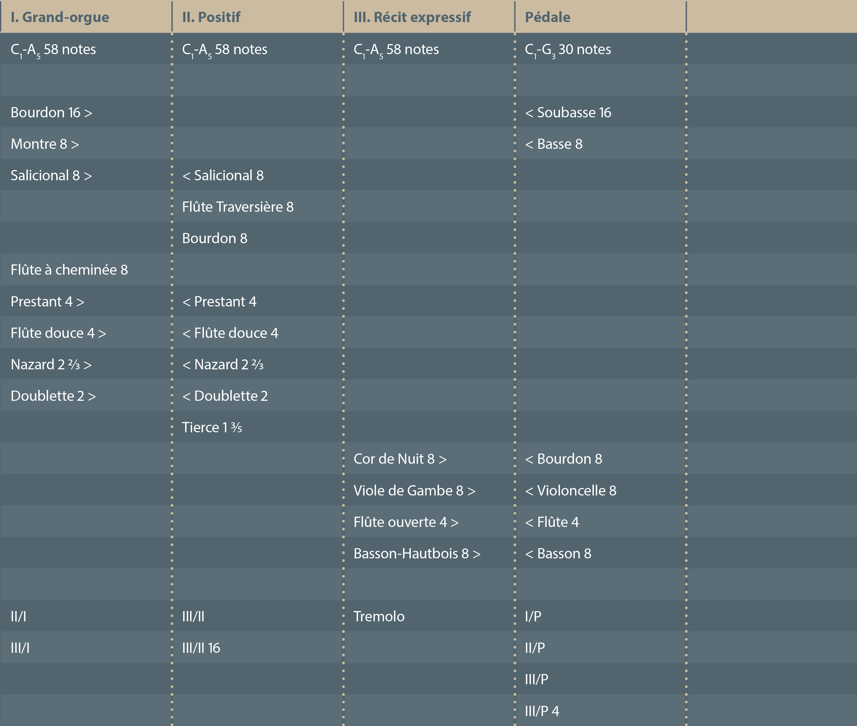 Orgue d'étude et de concert, à la composition réduite mais avec 3 claviers dont un expressif, imaginé pour le répertoire post-classique, romantique, et symphonique.