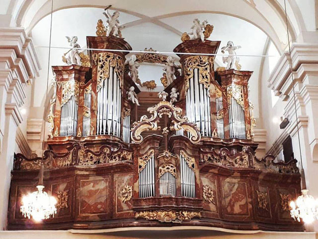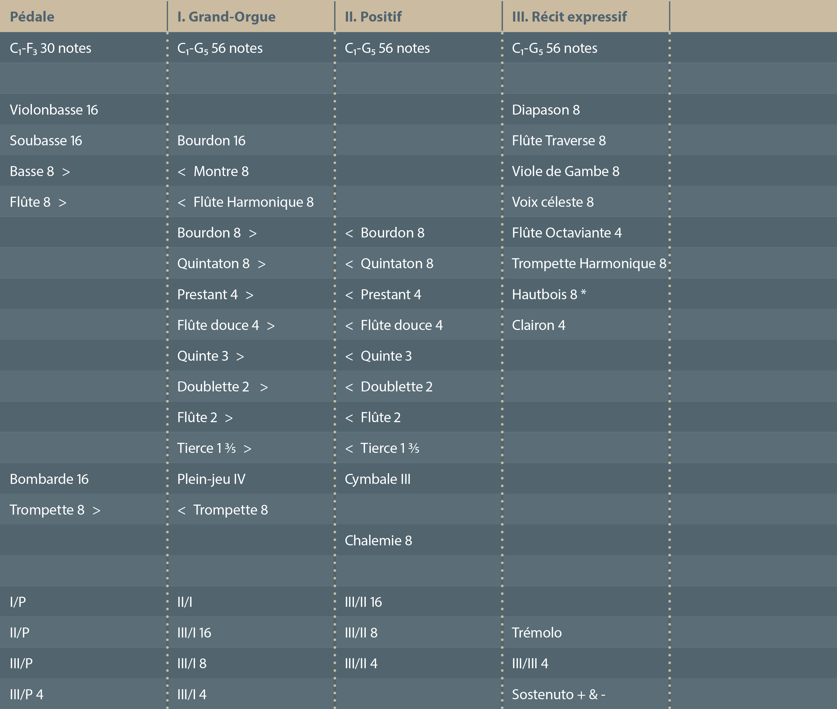 Dans un buffet ancien du XVIIIème siècle avec ajout contemporain dans la partie centrale où se trouvait la partie actuellement en balustrade. Réutilisation de 3 registres en bois du XXème siècle.