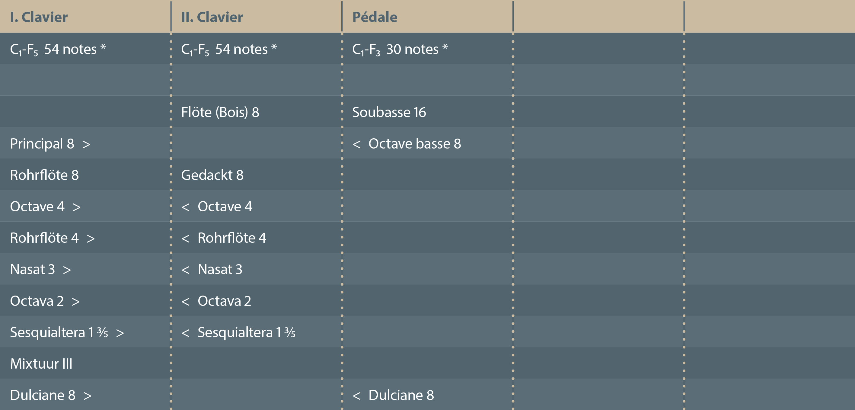 N.B. : les "<" et ">" indiquent les jeux baladeurs, pouvant être appelés à un clavier ou l'autre selon le choix du musicien.