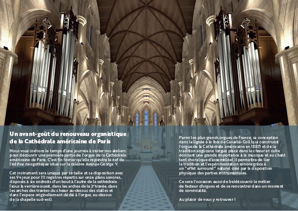 Nous vous invitons le temps d'une journée à visiter nos atelier, pour voir avant son montage déjà une partie de l'orgue de la Cathédrale Américaine de Paris qui rejoindra la nef de l'édifice néogothique situé sur la célèbre Avenue George V à la fin du mois de février.